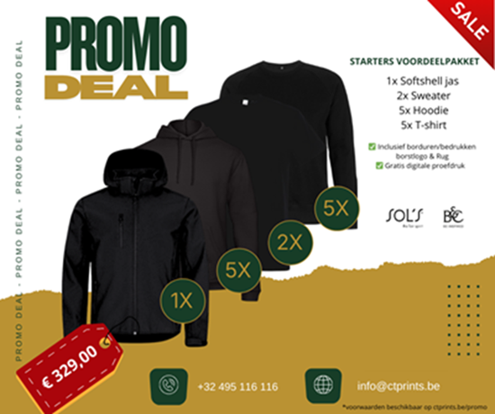 Met dit pakket ben je direct klaar om je team uit te rusten met stijlvolle, hoogwaardige kleding die perfect past bij jouw bedrijf. Klaar om te starten? Neem vandaag nog contact met ons op via info@ctprints.be